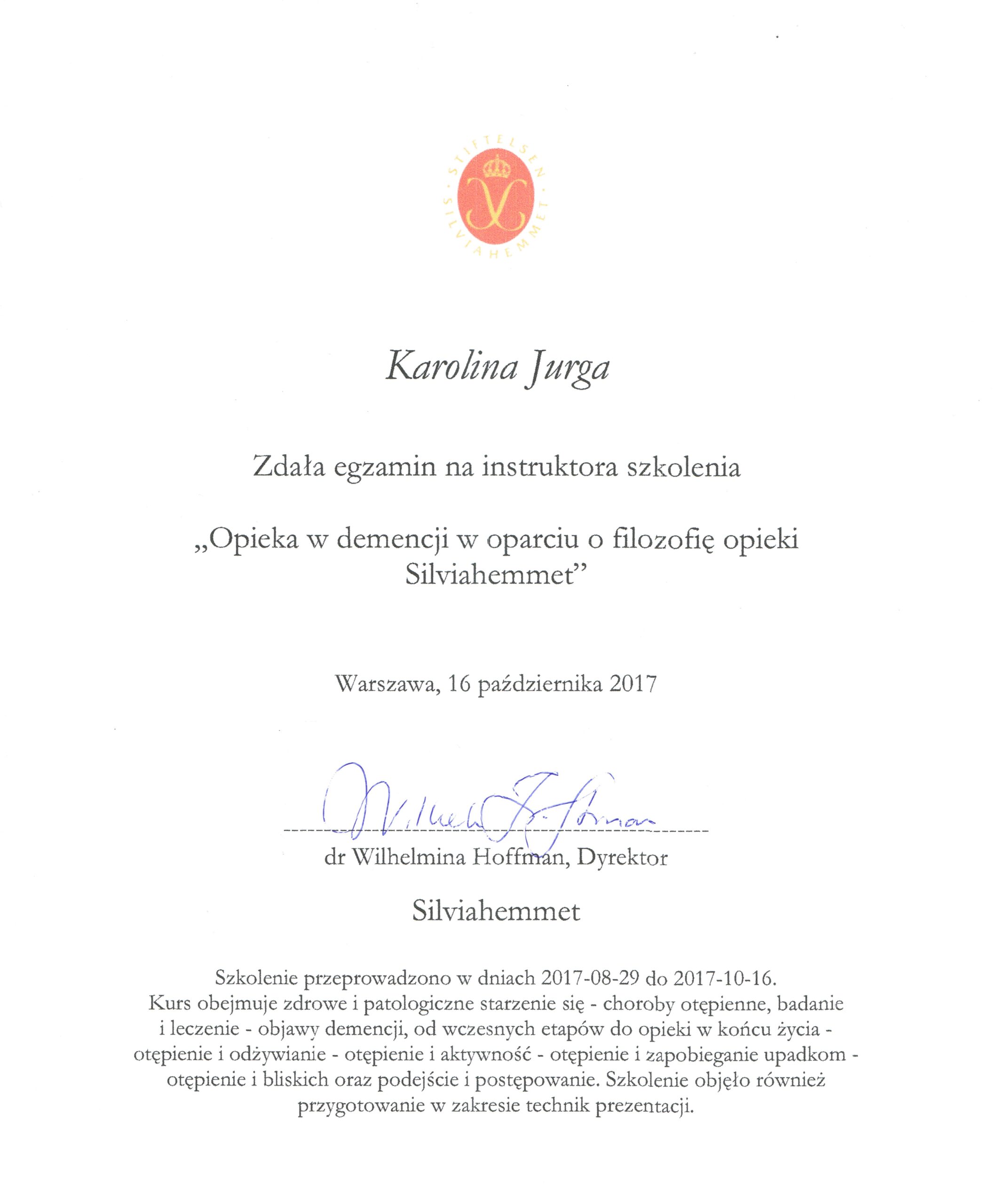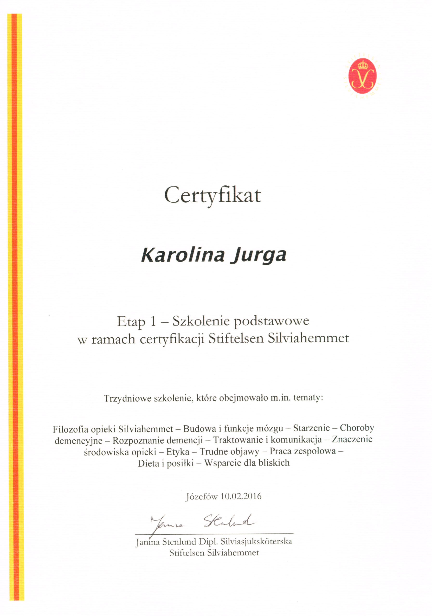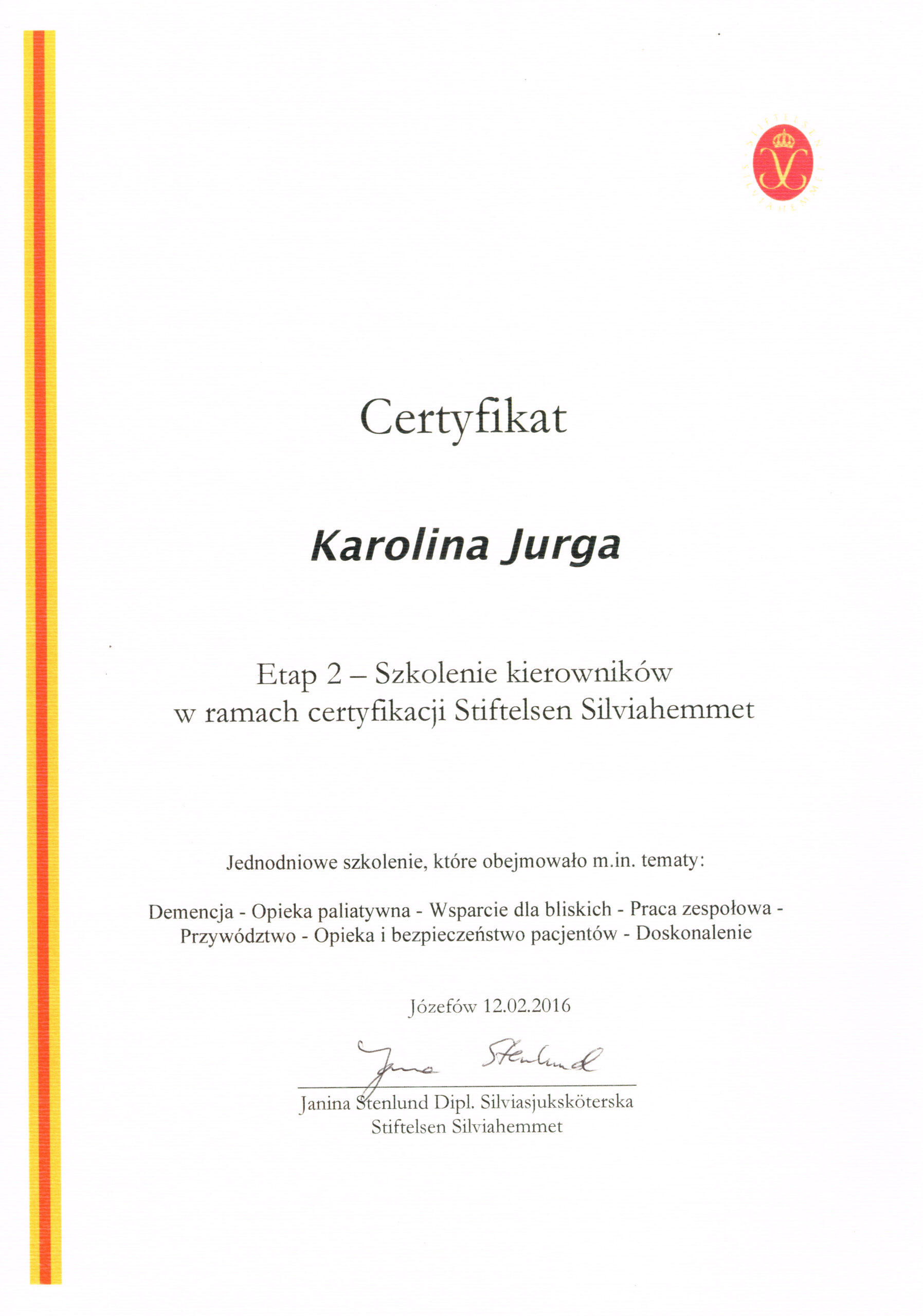 Przeszłam certyfikację trenerską SCI (Swedish Care International) prowadzoną zgodnie z wytycznymi i standardami Fundacji Stiftelsen Silviahemmet.
